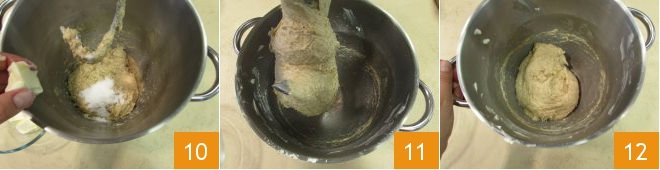 and the first piece of butter 10. Continue kneading everything at moderate speed, adding the butter little by little until the dough is well bonded 11. Then detach it from the hook 12