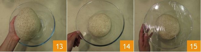 and transfer the dough to another bowl, trying to give it a spherical shape (13-14). Cover with plastic wrap 15 and let it rise for 2 hours at room temperature.