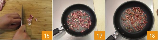 When almost two hours have passed, take the bacon. Cut it into cubes about 1/4 inch large 16, then transfer them to a pan 17 and sauté over medium heat for 5 minutes 18. Set aside and let cool.