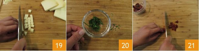 Meanwhile, cut the provolone into cubes 19, chop the aromatic herbs 20, and cut the sun-dried tomatoes into pieces 21.