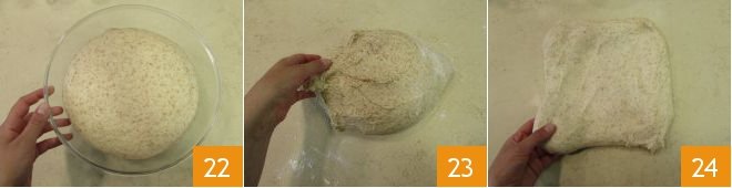 When the dough is well risen 22, transfer it to a lightly floured surface 23 and spread it out gently with your hands 24.