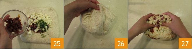 Place bacon, provolone, sun-dried tomatoes, and the aromatic herbs in the center 25. Close the dough 26 and knead it to incorporate all the ingredients 27.