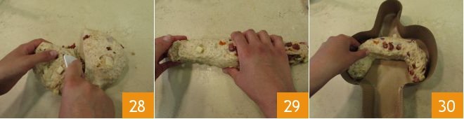 Then divide it in half 28 and shape each portion into two logs about 12 inches long 29. Place the first one in the mold to form the wings 30,