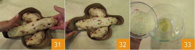 and then place the second on top to form the body of the dove (31-32). Cover with a cloth and let rise for another 2 hours. At this point, you can prepare the glaze. In a bowl, pour the egg whites, grated cheese 33