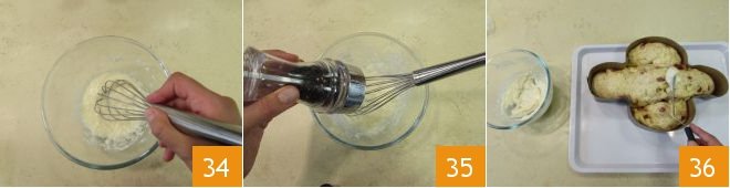 and beat everything with a whisk 34; finally, also incorporate the pepper 35 and mix one last time. Take the colomba that has risen and spread the glaze obtained over the entire surface 36