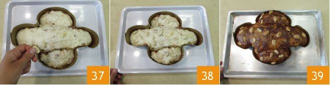 Sprinkle some almonds 37 and some peanuts 38 as well. Then bake in a preheated static oven at 375°F for 50 minutes, placing it on the lower shelf and placing another baking sheet on top, so as not to over-brown the glaze. Always do the toothpick test before removing from the oven and let your savory colomba cool before serving 39.