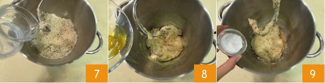 then also pour in the water 7 and continue to work. Slowly incorporate the eggs 7 and when they are well blended, add the salt 9