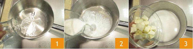 To make the savory cream puffs with Grana Padano cream, start by preparing the choux pastry: first, pour the water 1, milk 2, and salt into a saucepan. Add the cubed butter 3 and bring everything to a boil.