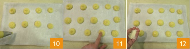 Now take a baking sheet and line it with parchment paper; to make it stick to the tray, squeeze a little batter in opposite corners and in the center to act as an adhesive. Squeeze mounds of dough the size of a walnut 10, spacing them apart. Once you've filled the tray, slightly flatten the tops of the puffs to smooth the tips 11. Sprinkle 10 g of Grana Padano PDO over each puff 12. Bake in a preheated static oven at 428°F for about 15 minutes, until golden brown. Avoid opening the oven at this stage. After this time, finish baking at 356°F for another 15-20 minutes, mimicking an open valve by wedging a ball of aluminum foil between the door and the oven's frame.