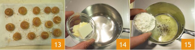 Remove the cream puffs from the oven and let them cool before filling them 13. Prepare the Grana Padano PDO cream: in a saucepan, add the butter 14 and melt it over medium heat, then add the pepper and pour in the flour 15.