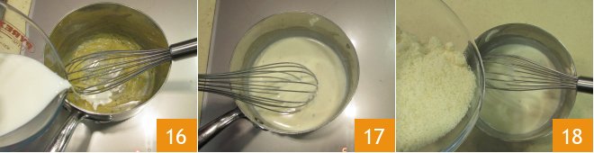 Stir quickly with a whisk, then pour in the whole milk 16 and bring to a boil until it thickens. Once thickened 17, turn off the heat, add the Grana Padano PDO 18, and stir to melt it.