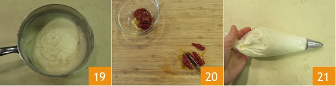Let cool to room temperature 19. Then transfer the cream to the fridge to cool completely. Meanwhile, drain the sun-dried tomatoes and slice them into thin strips 20. Once the cream is cold, transfer it to a piping bag fitted with a star nozzle 21.