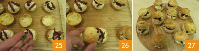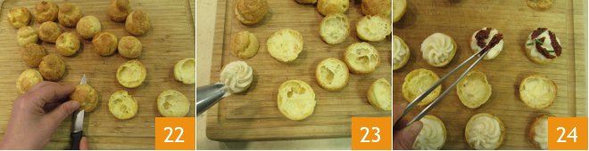 Cut the cream puffs in half, now cool 22. Fill the base of the puffs with Grana Padano PDO cream 23 and some sun-dried tomatoes 24.