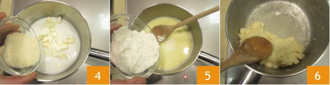 Add 20 g of Grana Padano PDO 4 and stir with a spatula or wooden spoon. At this point, add the flour all at once 5 and mix. Don't be afraid of lumps and stir quickly; cook the mixture until a white film forms on the bottom of the pan, which will take at least 2-3 minutes 6.