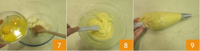 Transfer the batter to a bowl and add one egg at a time 7, always stirring to incorporate it. Don't worry if the dough seems separated at first, just keep mixing. Only when each egg is completely absorbed should you add the next one. Once the eggs are incorporated, you should have a smooth and consistent dough 8. Then transfer it to a pastry bag fitted with a plain 12-13 mm nozzle 9.