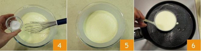 and the salt 4 and mix everything with the whisk: you should obtain a smooth, lump-free batter 5. Heat a crepe maker about 8.5 inches in diameter (or a large pan with a double bottom), grease it with a little butter spread over the surface and pour a ladle of batter in the center 6;