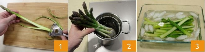 To prepare the savory log with salmon mousse, asparagus, and prawns, start by cleaning the asparagus: trim the stalks and peel them with a vegetable peeler to remove the outer and fibrous part 1; then tie them with kitchen twine and boil them for a few minutes in an asparagus pot 2 (you can also boil them in a large pan without tying them). Once blanched, drain them (they should be tender but not falling apart) and let them cool on a cutting board or dip them in a bowl with ice: this will ensure they retain all their brightness 3