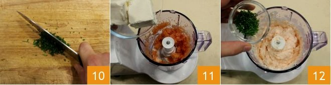 chop the chives as well 10, then in a blender cup, pour the salmon and the cream cheese 11, then blend everything and add the chives 12: you should get a creamy and homogeneous mixture.