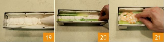 With the help of a piping bag, pour 1/4 of the salmon mousse into the mold 19. Place the asparagus along the inner perimeter, trying to overlap them as little as possible 20, and the prawns, cut in half lengthwise, in a row in the center (leave 4 whole for decoration) 21. Place the bread scraps to create a middle layer and then repeat the layer of mousse, asparagus, and prawns.
