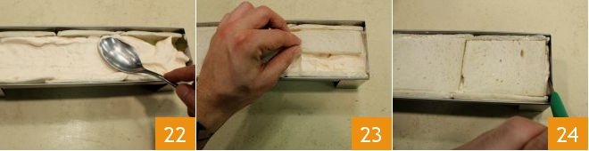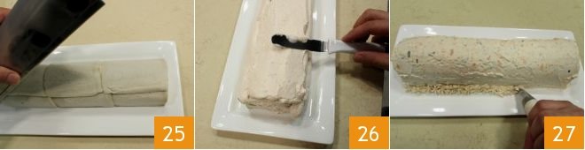 Then cover with more mousse, evenly distributed with the back of a teaspoon, leaving no more than 5 mm from the edge of the mold 22. Refrigerate to solidify for at least 30 minutes. After the necessary time, with the blade of a small knife, detach the log from the walls 24