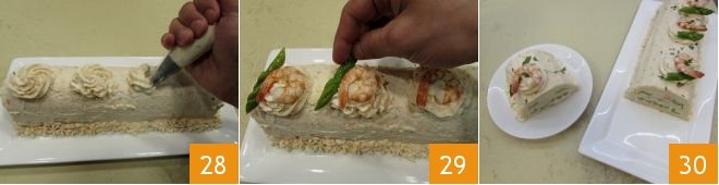 create 4 larger ones on the surface 28 and decorate with 4 whole asparagus tips and 4 prawns 29. Your savory log with salmon mousse, asparagus, and prawns is ready to be served!