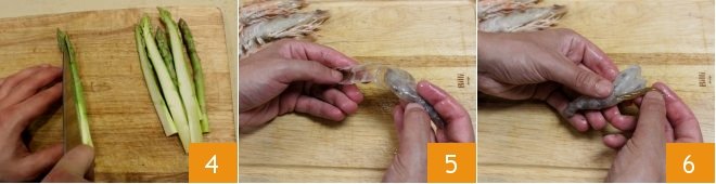 Cut them in half lengthwise 4, leaving 4 whole tips for decoration; then set aside. Move on to cleaning the prawns (you can also use shrimp instead) by removing the shell 5 and gently removing the intestine (the black thread inside the prawn's body) 6.