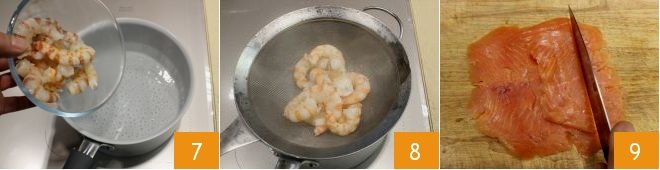 Boil the prawn tails 7 and then drain them after 3-4 minutes 8; set aside. Meanwhile, prepare the salmon mousse: coarsely chop the smoked salmon slices 9