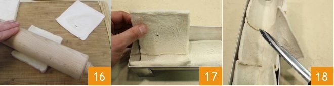 With a rolling pin, slightly flatten and lengthen 10 slices of sandwich bread 16; then line a log mold by slightly overlapping the slices inside 17. Trim the excess with a knife 18; keep the excess that will serve as alternating layers to the rest of the filling.