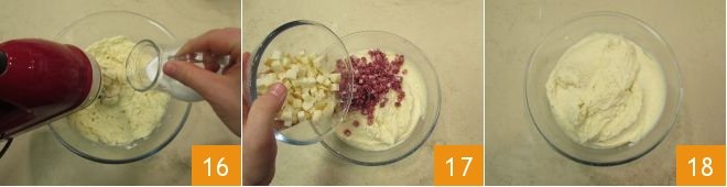softening, if necessary, with milk poured slowly 16. You should obtain a soft and creamy mixture. Turn off the beaters and add the diced cheese and salami 17. Finally, mix to incorporate everything 18.