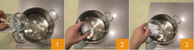 To prepare the savory migliaccio, start by pouring the water into a steel pot 1. Then add salt 2 and lard and let it come close to boiling 3. Stir with a spoon or whisk to help the lard melt.