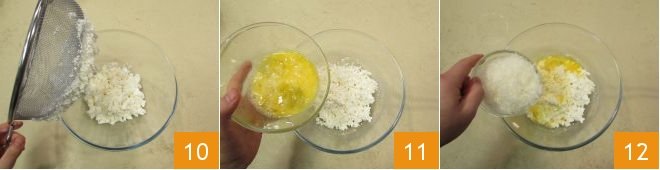 remove the sieve 10 and then add the eggs 11, grated Pecorino 12, and Parmesan.