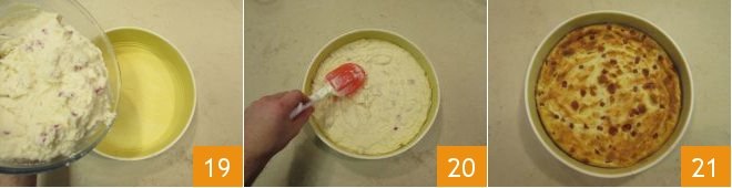 Pour the mixture into a pre-greased 28 cm (11 inches) pan (you can use lard if you prefer) and dusted with semolina (or corn flour) 19; level the surface carefully 20. Bake in a static oven, preheated, at 350°F for about 60 minutes, then cover with foil and continue cooking for an additional 45 minutes: in total, it should bake for 105 minutes. Once done, let the savory migliaccio cool slightly before unmolding and enjoying it 21.
