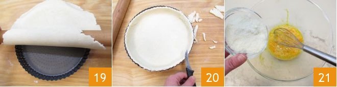 wrap the dough around the rolling pin and place it inside a perforated pan (if you don't have one, butter and flour the pan first) 19; remove excess dough with a knife 20. In a large bowl, add the eggs and mix with the pecorino cheese 21,