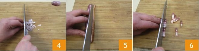 Meanwhile, prepare the filling by peeling and finely chopping the shallot 4. Then remove the rind from the smoked bacon 5 and cut it into half-inch strips 6.