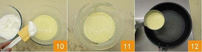 Fold the beaten egg whites into the batter 10, gently mixing from the bottom up with a spatula. When the batter is ready 11 you can move on to cooking: heat a nonstick skillet (preferably with a thick base) greased with butter, pour a ladleful of batter into the center 12,