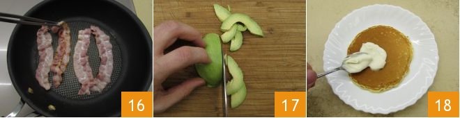 Now take care of the filling: in the same pan you used to cook the pancakes, fry the slices of bacon for a couple of minutes, until they are crispy 16. Now peel the avocado, cut it in half, remove the pit and slice it thinly 17. Everything is ready to assemble the pancakes: place a pancake on a plate, spread a layer of sour cream