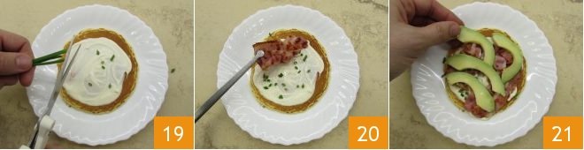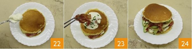 Now place another pancake on top and fill as before with sour cream 22, chives, bacon 23 and avocado. Each serving requires 3 pancakes. Close with another pancake and serve your pancakes with bacon and crème fraîche immediately 24.