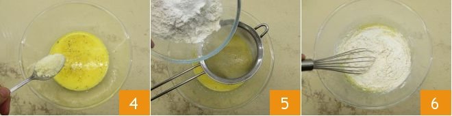 add the grated cheese as well 4. At this point incorporate the flour and baking powder by sifting them through a sieve 5. Mix well with the whisk 6