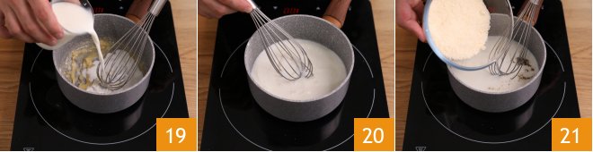 At this point, pour in the whole milk 19, mix and bring to a boil 20. Add a pinch of pepper, the Grana Padano PDO 21