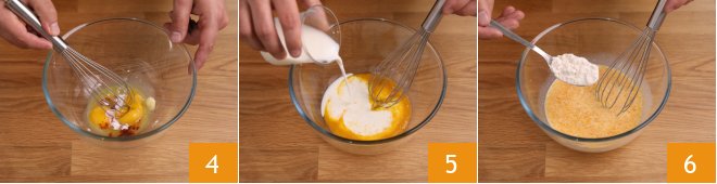 and use a hand whisk to mix well until a homogeneous mixture is obtained. Pour the milk in a thin stream 5, incorporating it well by mixing with the whisk. Add a couple of tablespoons of flour 6