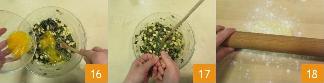 and the eggs 16. Season with another pinch of salt and then add the thyme leaves 17. At this point, the shortcrust pastry should be ready. Retrieve it, remove the plastic wrap, and roll it out on a lightly floured work surface 18.