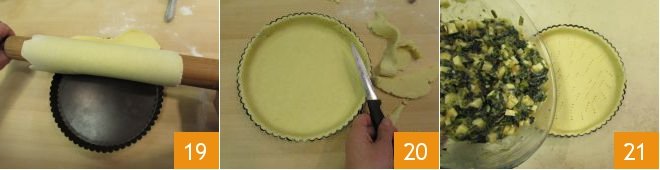 Roll out the dough until you get a disk about 1/4 inch thick. Wrap it around the rolling pin and unroll the shortcrust pastry into a fluted 9-inch pan 19. Trim the excess with a knife 20. Prick the base with a fork and then pour in the filling 21.