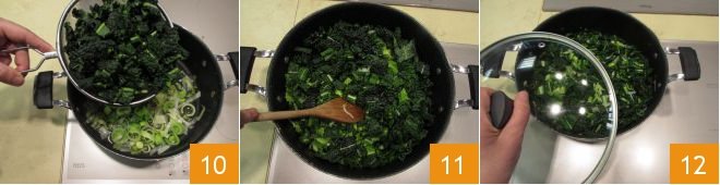 At this point, you can add the black cabbage 10, season with salt and pepper, and stir 11. Cover with a lid and cook over medium heat for 15 minutes; remember to stir occasionally 12.