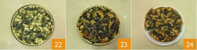 Your savory pie is ready 22 to bake in a static oven, preheated to 355°F, on the lowest shelf (not in contact with the base) for about 55 minutes. If you notice the pie is turning too golden halfway through, cover it with a sheet of aluminum foil 23. The savory pie with black cabbage is ready; wait a few minutes before removing it from the mold and enjoying it 24!