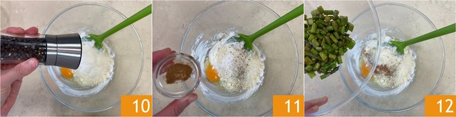 Season with salt and pepper 10. Add nutmeg 11 and the asparagus stalks 12, keeping aside the tips for decoration. Mix to obtain a homogeneous mixture.