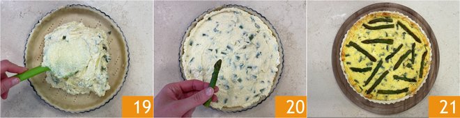 Pour the filling into the cake pan and level the surface 19. Decorate with the asparagus tips 20, lightly press down the edges of the shortcrust pastry to lower it to the level of the filling, and bake in a static oven at 356°F for 30-35 minutes. Remove from the oven and let cool slightly before serving your savory pie with ricotta and asparagus 21!