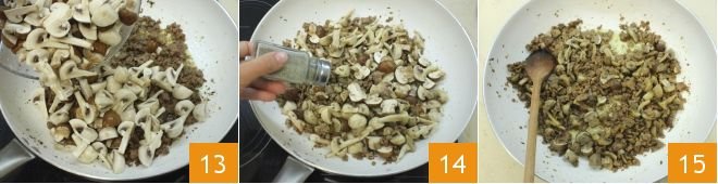 After this time, add the chopped mushrooms you set aside 13, keeping some for the final decoration of the tart, and adjust the salt and pepper to taste 14, then let it cook for another 15 minutes over low heat, covering with a lid, until they are slightly wilted 15. Turn off the heat and set aside.