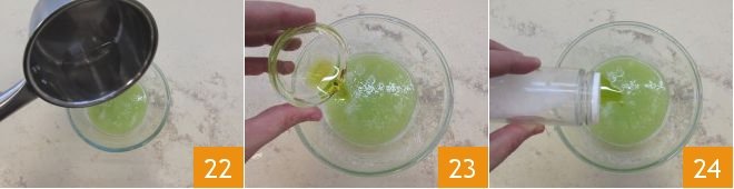 to be added to the cucumber pulp 19 and blend to obtain a puree 20. Strain it through a fine mesh sieve 21.