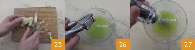 Clean the ginger 25 and cut it into pieces the size of garlic cloves, so you can squeeze it with a garlic press 26, to extract a juice to add to the mixture. Finally, season with pepper 27 and mix.