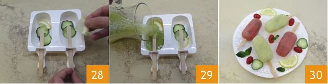 Place the cucumber and lemon slices inside the popsicle molds 28. Also transferring the mixture into a jug to simplify the operation, pour the cucumber, ginger, and lemon puree into the molds 29 and transfer them to the freezer for at least 6 hours. After the freezing time, unmold your savory popsicles 30 and enjoy them immediately!